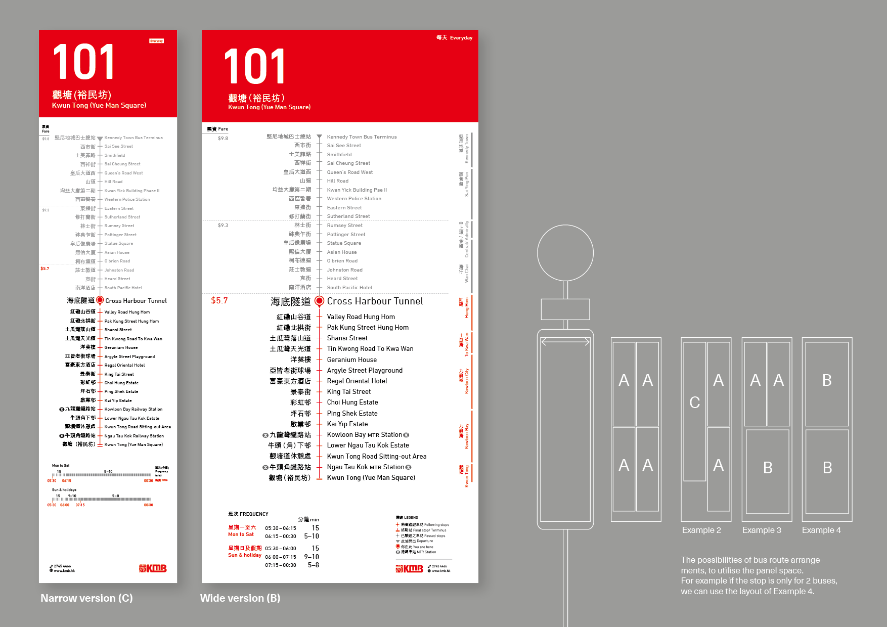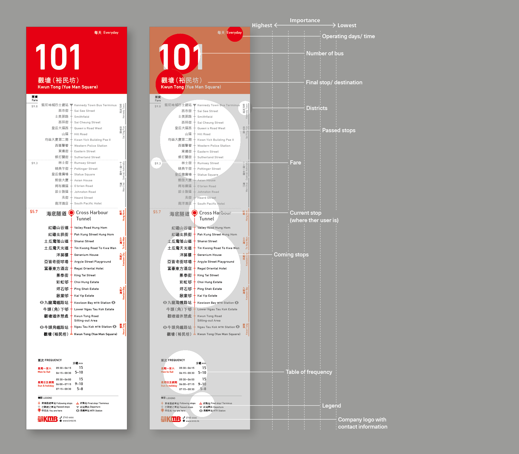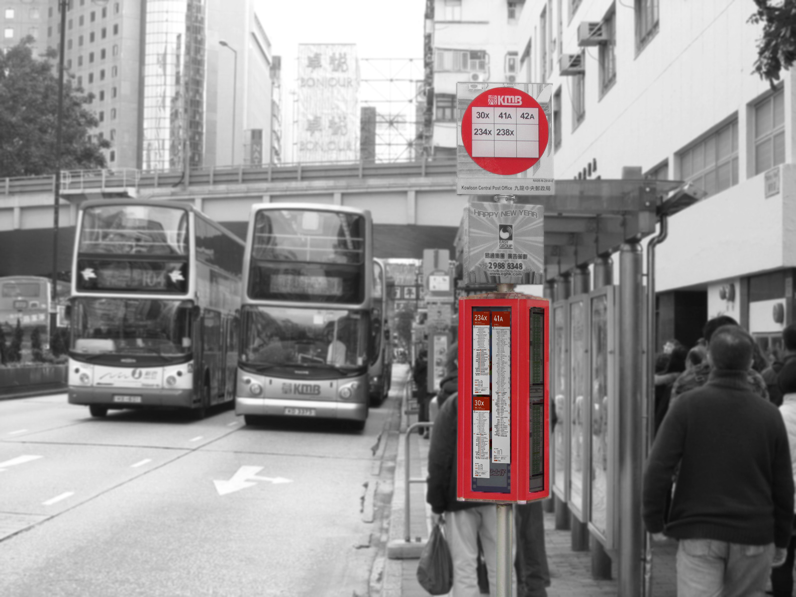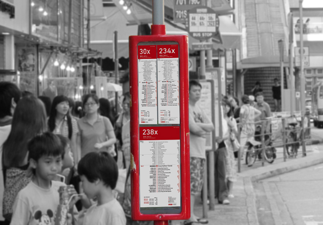 A project to redesign the system of bus stop information panels in Hong Kong. A new information visualisation approach is adopted, so that the information could be understand more easily and quickly. Different information are now re‑arranged according to the importance and users' need and preferences, as reflected in user tests.