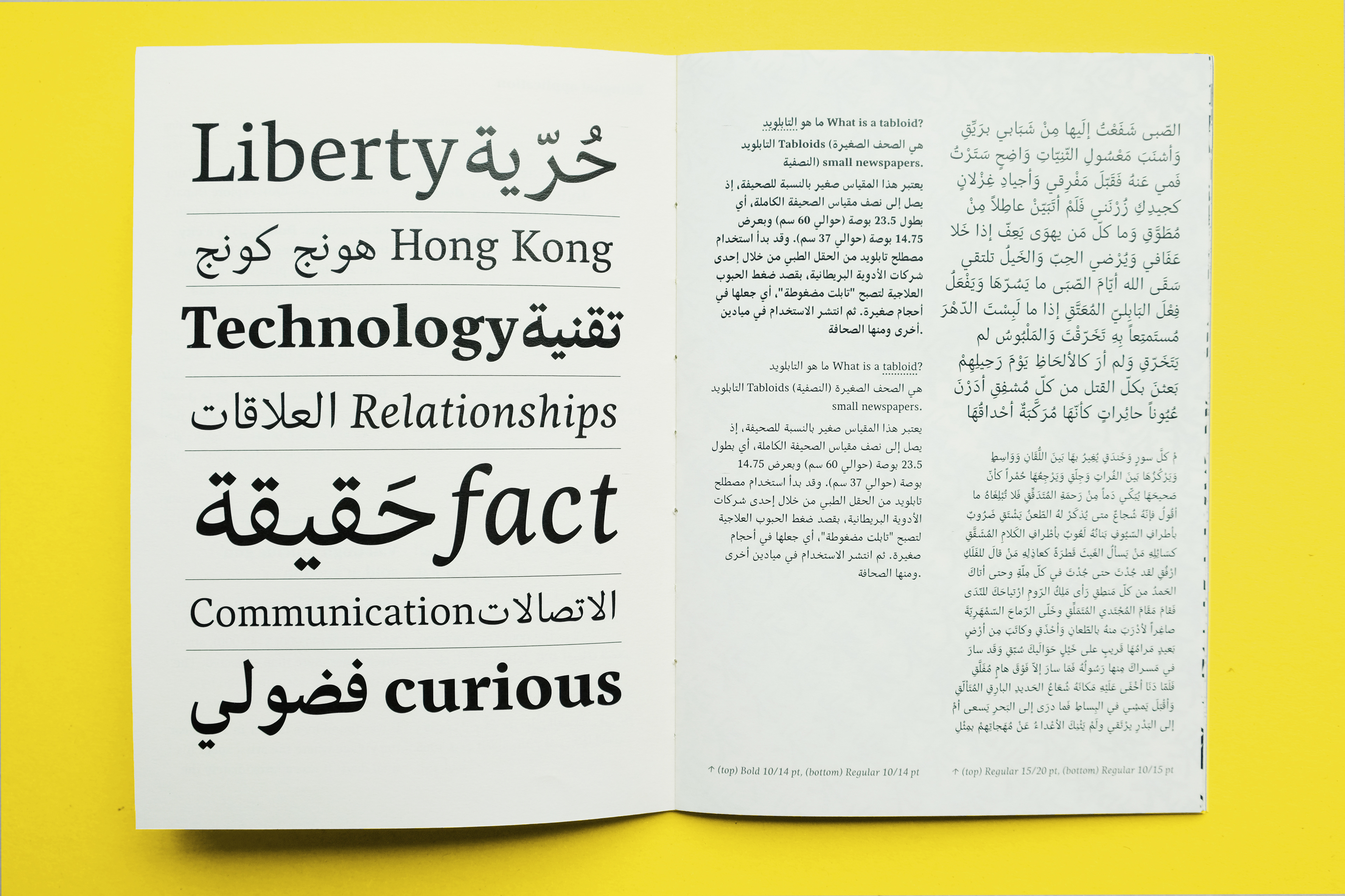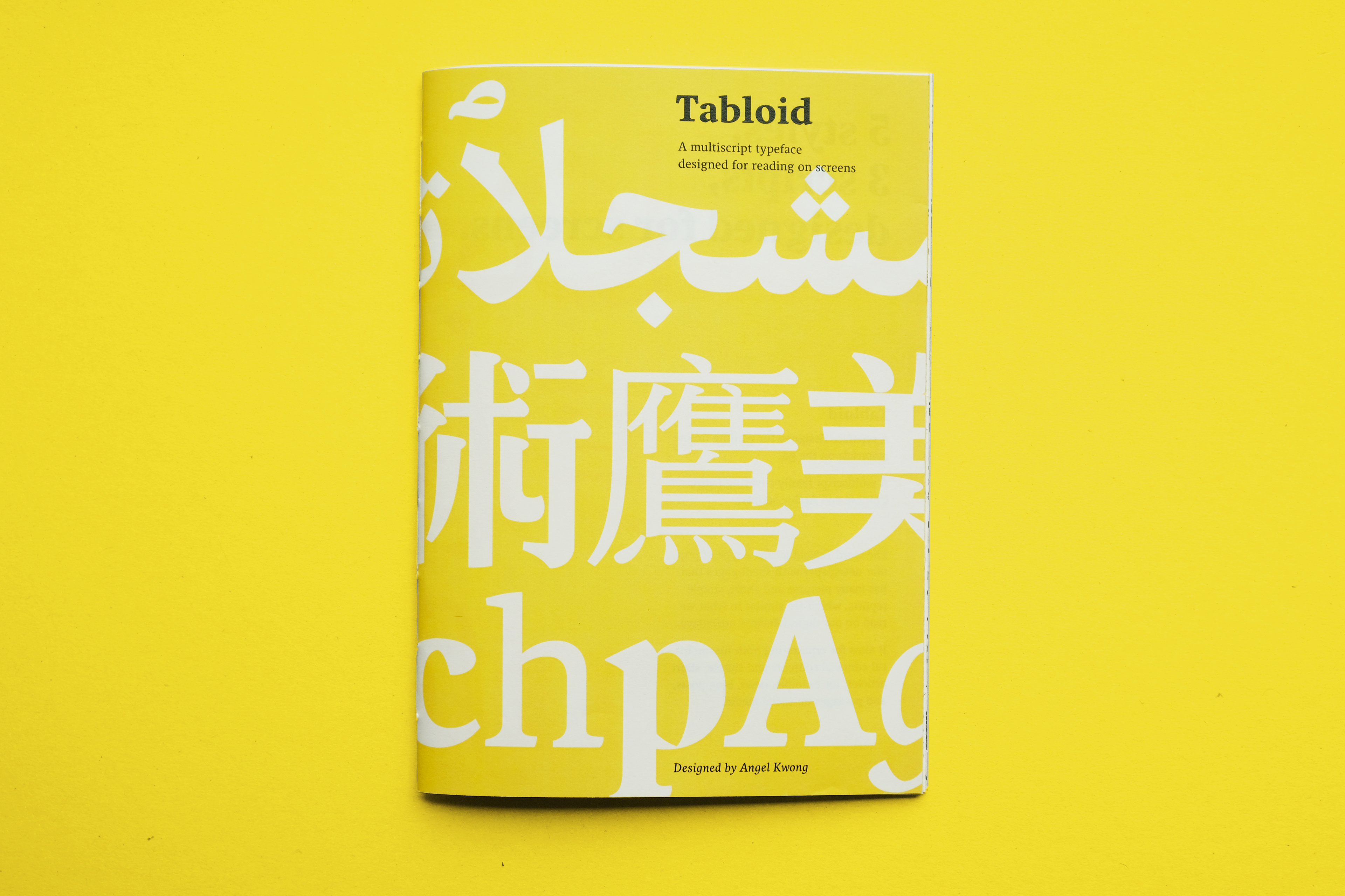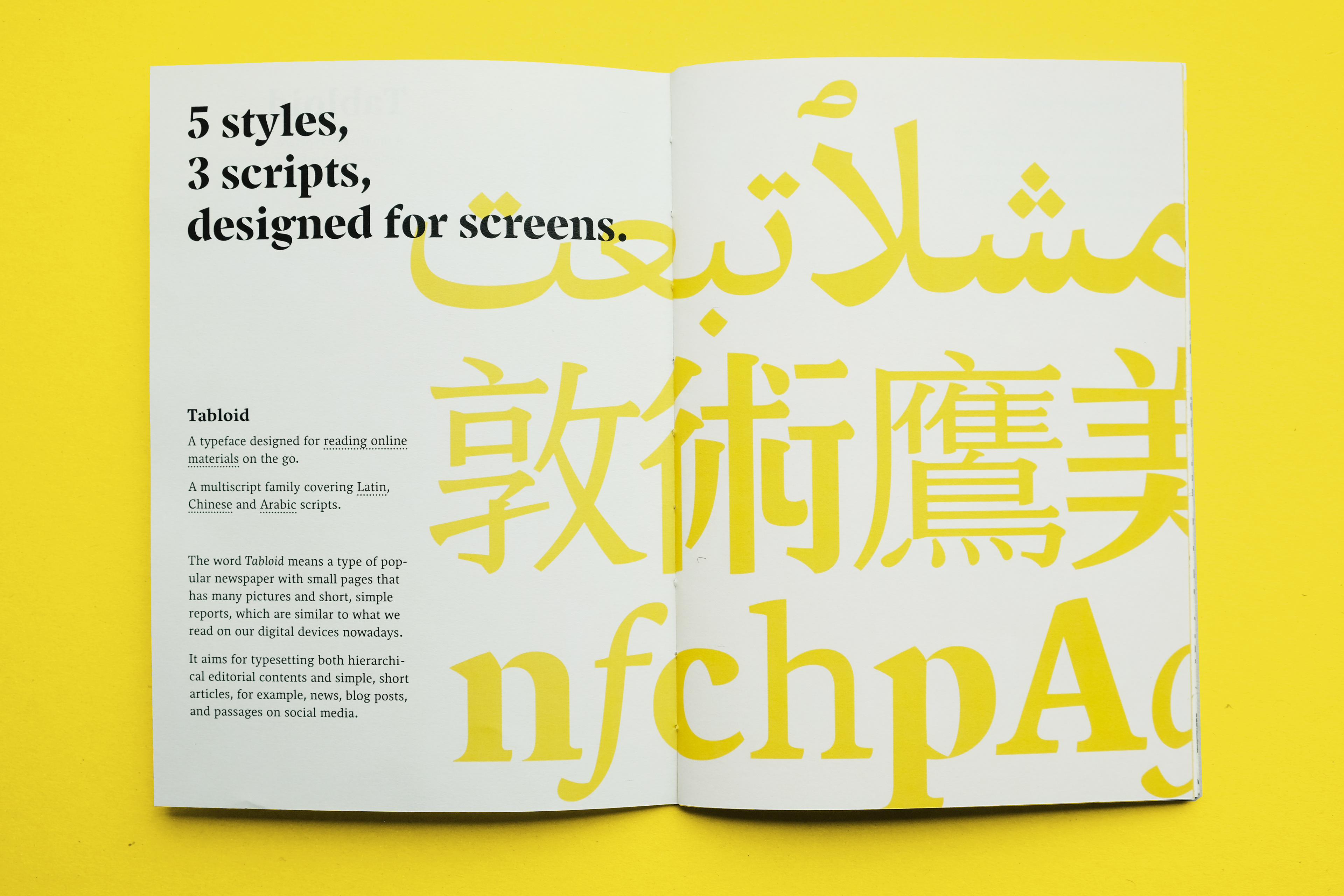 A type specimen for the multiscript type family Tabloid. It features large-size letterforms, variety of sample texts, multiscript alignment, and the specialities of the typeface, etc.